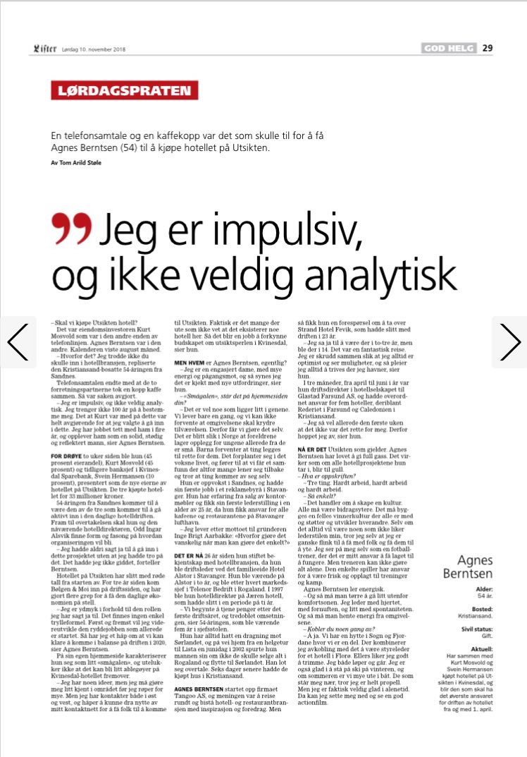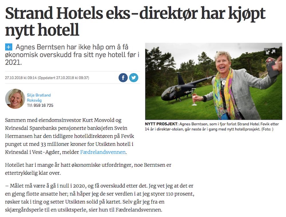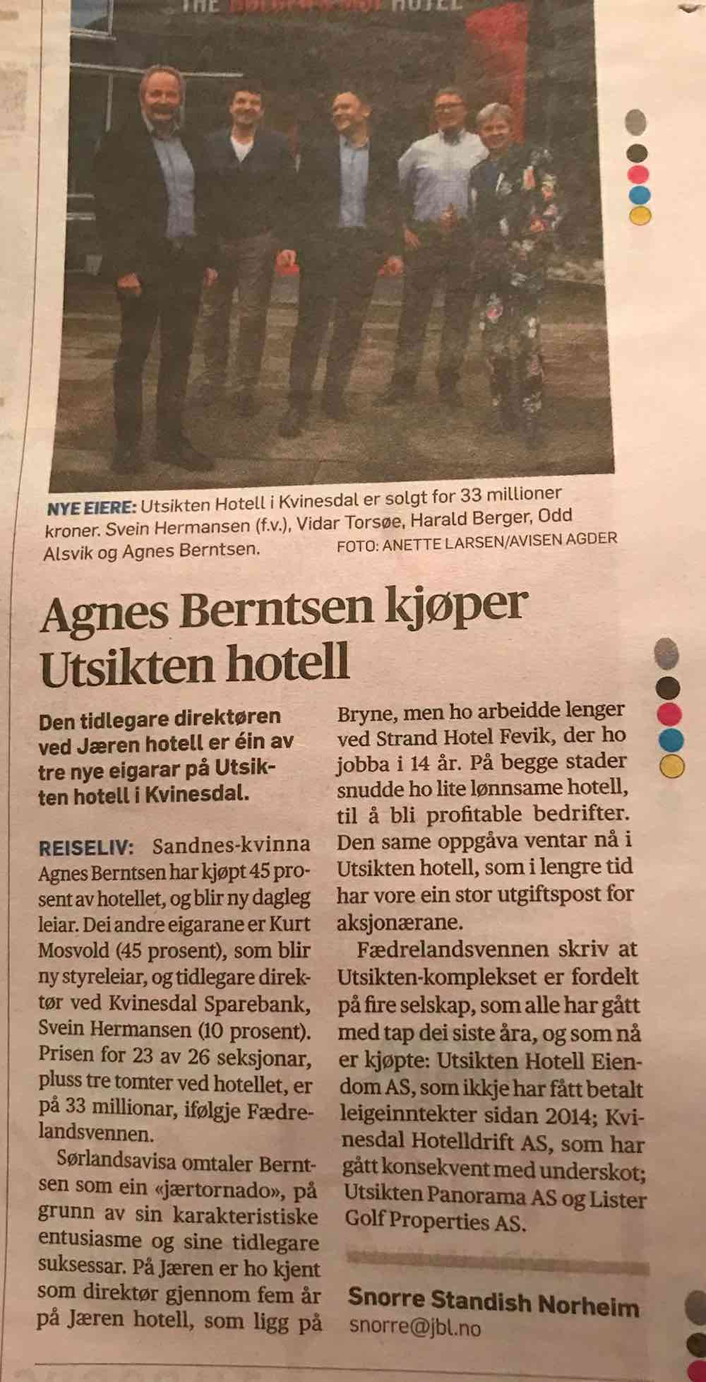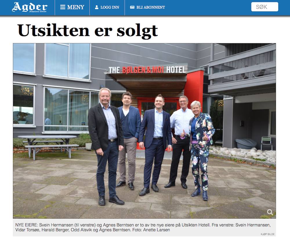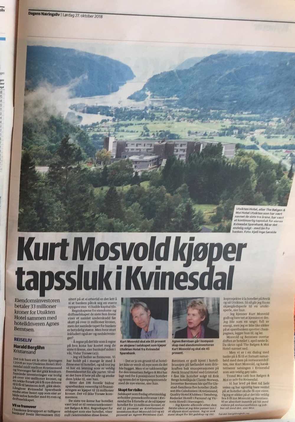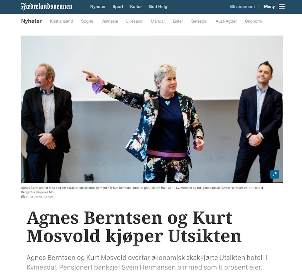 Sammen med eiendomsinvestor Kurt Mosvold og Kvinesdal Sparebanks pensjonerte banksjefen Svein Hermansen, har jeg kjøpt Utsikten hotell i Kvinesdal.