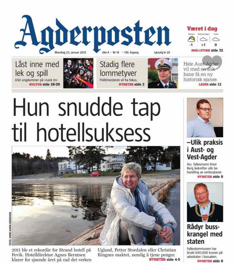 «Hotelldirektør Agnes Berntsen har klart det verken Ugland, Petter Stordalen eller Christian Rignes maktet – å gjøre god butikk av Strand Hotel Fevik. 2011 ble et rekortår for det tidligere problemhotellet.. (Agderposten 23. januar 2012)«